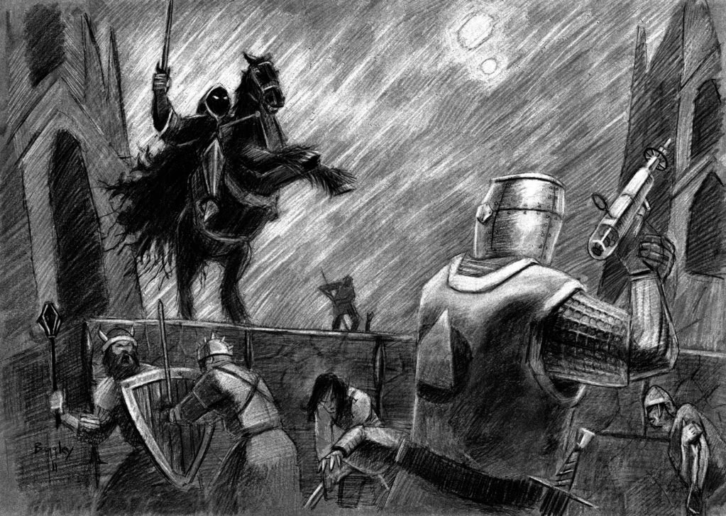 Each of the legends gets a full page with a line art illustration from the terrific Paul Gallagher; basic statistics, abilities and attacks; and a special power unique to their type. The “good” legends in the book are: Blessed Crusader (a paladin with the ability to heal and turn undead and demons), Daring Rogue (a thief who may pickpocket), Enigmatic Enchanter (a magic-user with an innate magic missile attack) and Valiant Warrior (a fighting-man who can attack all enemies within reach). The “evil” legends provided include: Callous Corsair (a rogue who may set traps), Immortal Fiend (a demon-possessed warlock who gets stronger when wounded and can flood the enemy’s mind with dark thoughts), Merciless Warlord (a berserker chief) and Sinister Sorcerer (a sorcerer that can injure himself to boost spells and may conjure a defensive barrier). Each of these legends has a base cost of 50 gold pieces (“gp”), which you may increase by either buying higher statistics (you also get an initial pool of 3 points to increase your statistics without cost), by boosting or buying new attacks (essentially weapon proficiencies) or by purchasing magic items. Oddly, the ability to purchase magic items is not granted; rather, you must take the magic item ability a number of times equal to the magic items you wish to purchase. Not every legend has this ability, but each legend may choose three extra abilities without cost when they are hired (and more abilities can be earned by taking “disadvantages”—a kind of negative ability which penalizes the character in some way). In total, a fully upgraded legend would probably be in the range of 70 to 80 gp.